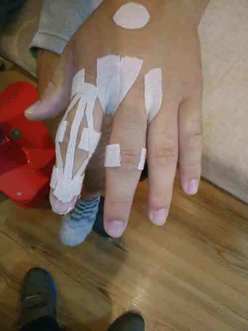 指の背側だけ貼ってみたのですが、腹側も先端から第1関節までの腫れが強かったので同様にスリットを。