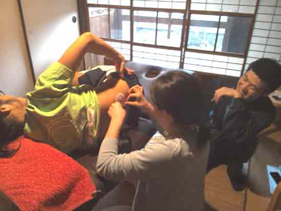 モニターを募集していたら、昨夜前回にツワリによる吐き気のテーピングをした女性のご主人が来られ、施術中「嫁さんがまた苦しんでいる」と言っておられたので、嫁さんにモニターになってもらう事にした。