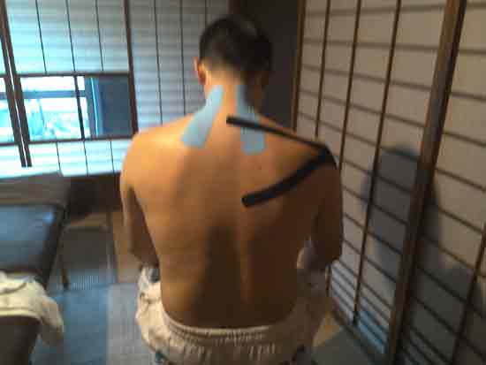 検査の結果、中僧帽筋が一番の原因だったのでテーピング(右の写真)。